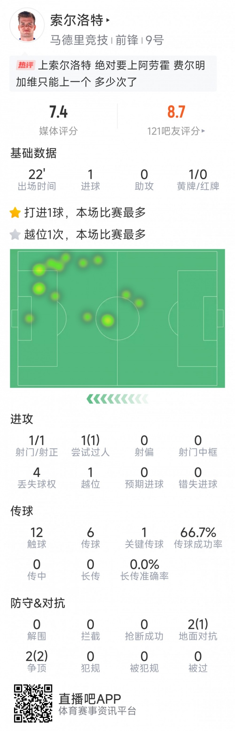2月26日訊 在本輪國王杯馬競4-4巴薩的比賽中,索爾洛特替補登場打進絕平進球。以下為他在本場數(shù)據(jù):