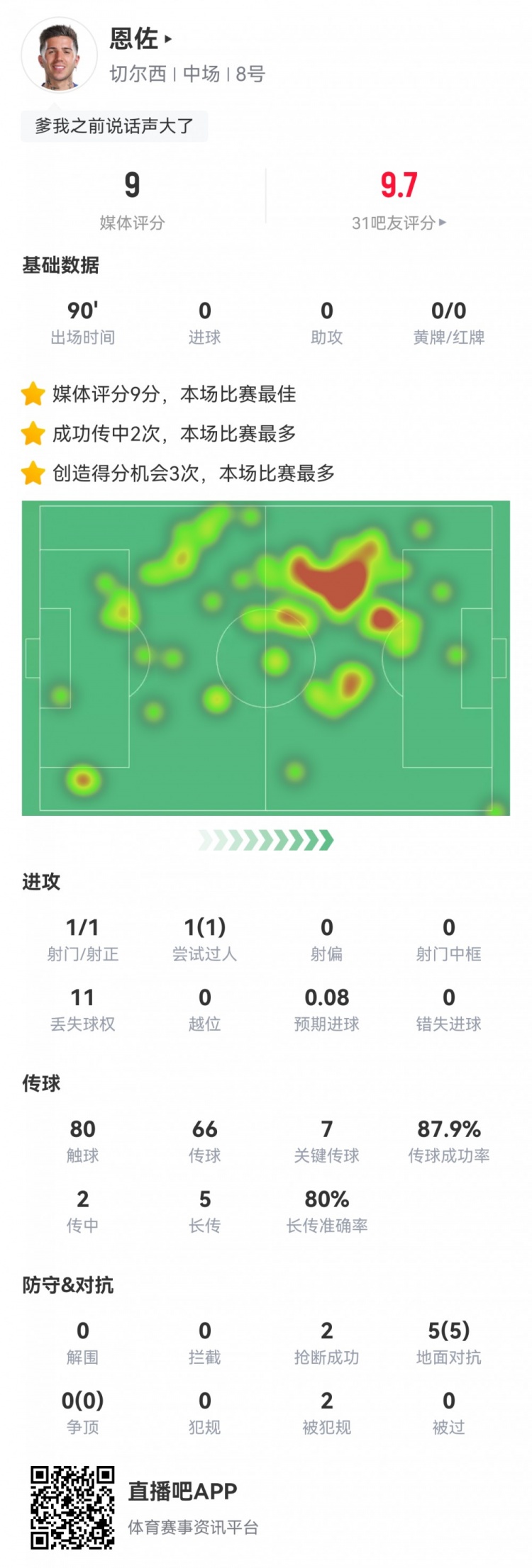 2月26日訊 本輪英超,切爾西4-0南安普頓。此役恩佐首發(fā)90分鐘被換下,球員全場(chǎng)重點(diǎn)數(shù)據(jù)如下↓