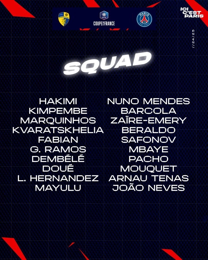 2月26日訊 北京時間2月27日凌晨4點10分,法國杯1/4決賽,巴黎圣日耳曼將在客場對陣布里奧欽。比賽開始前,巴黎官方公布了本場大名單。李剛?cè)省⒕S蒂尼亞、多納魯馬等人缺席,扎伊爾-埃梅里回歸。