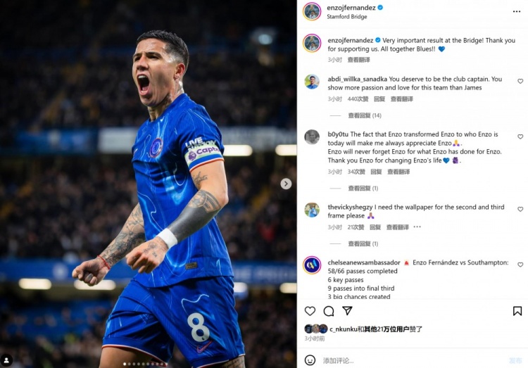 本場比賽恩佐首發(fā)出戰(zhàn)表現(xiàn)出色,貢獻7次關鍵傳球,賽后恩佐也在個人社媒曬出怒吼慶祝照,配文寫道:“在主場取得一場重要的勝利,感謝大家的支持,藍軍全員團結一致!”