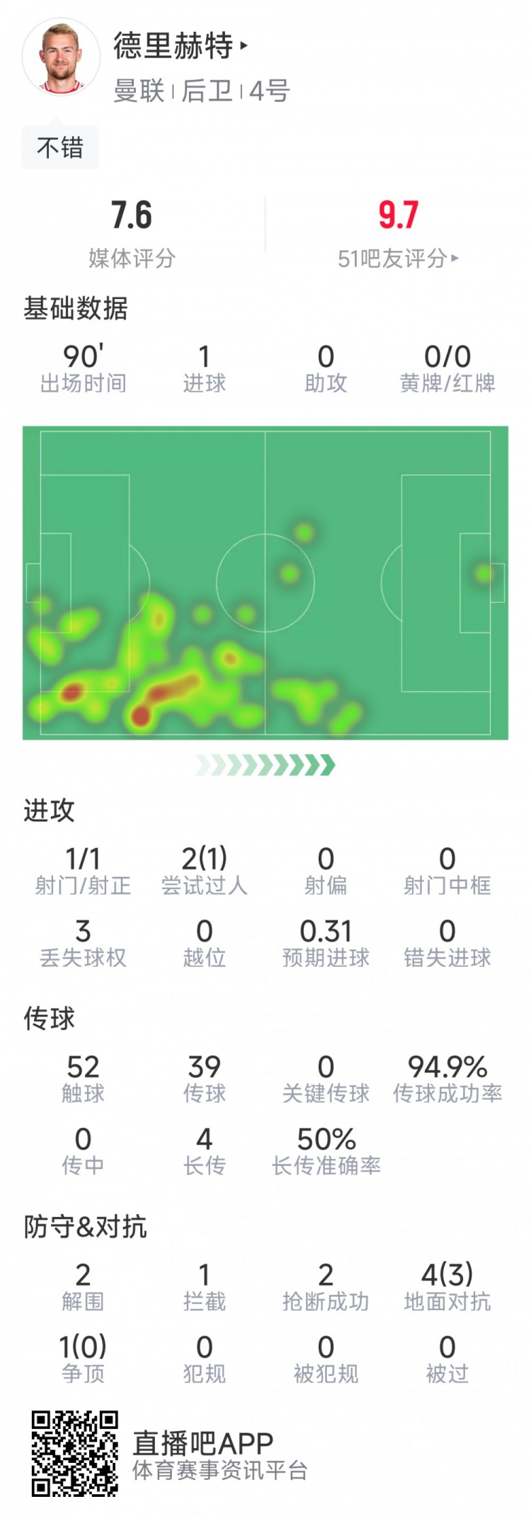 2月27日訊 在本輪英超,曼聯(lián)3-2擊敗伊普斯維奇,德里赫特破門,以下為他在本場數(shù)據(jù):