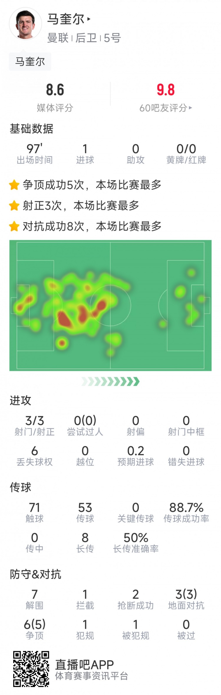 2月27日訊 在本輪英超,曼聯(lián)3-2擊敗伊普斯維奇。馬奎爾打進(jìn)關(guān)鍵進(jìn)球,以下為他在本場數(shù)據(jù):