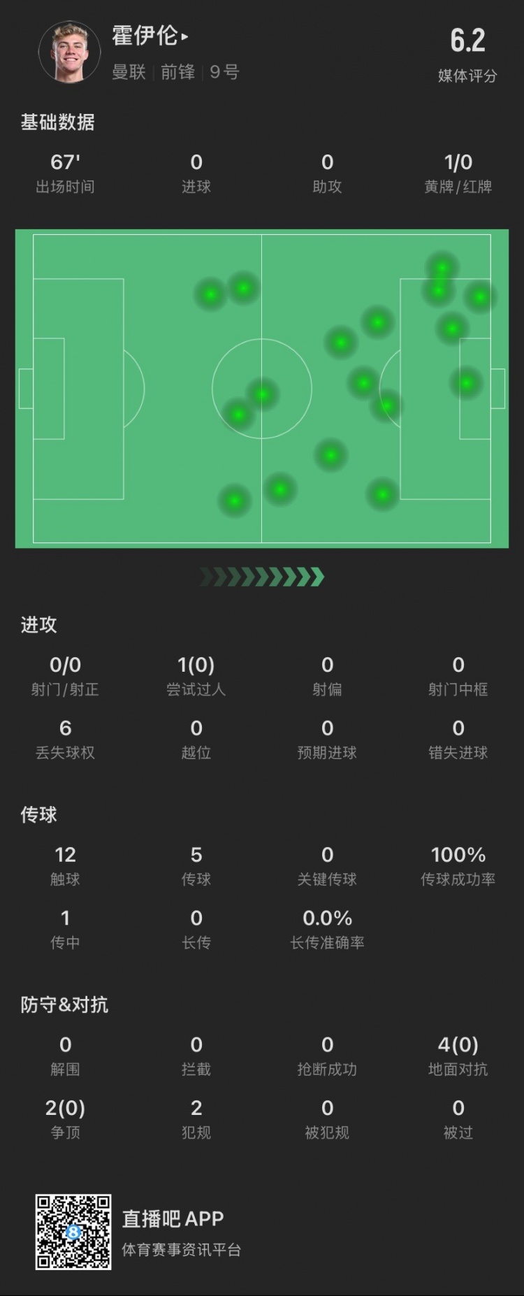 2月27日訊 英超第27輪,曼聯(lián)主場對陣伊普斯維奇的比賽正在進(jìn)行。第67分鐘,霍伊倫被換下場。本場比賽,他射門、關(guān)鍵傳球多項重要數(shù)據(jù)掛零,0對抗成功、0過人成功,獲評6.2分。