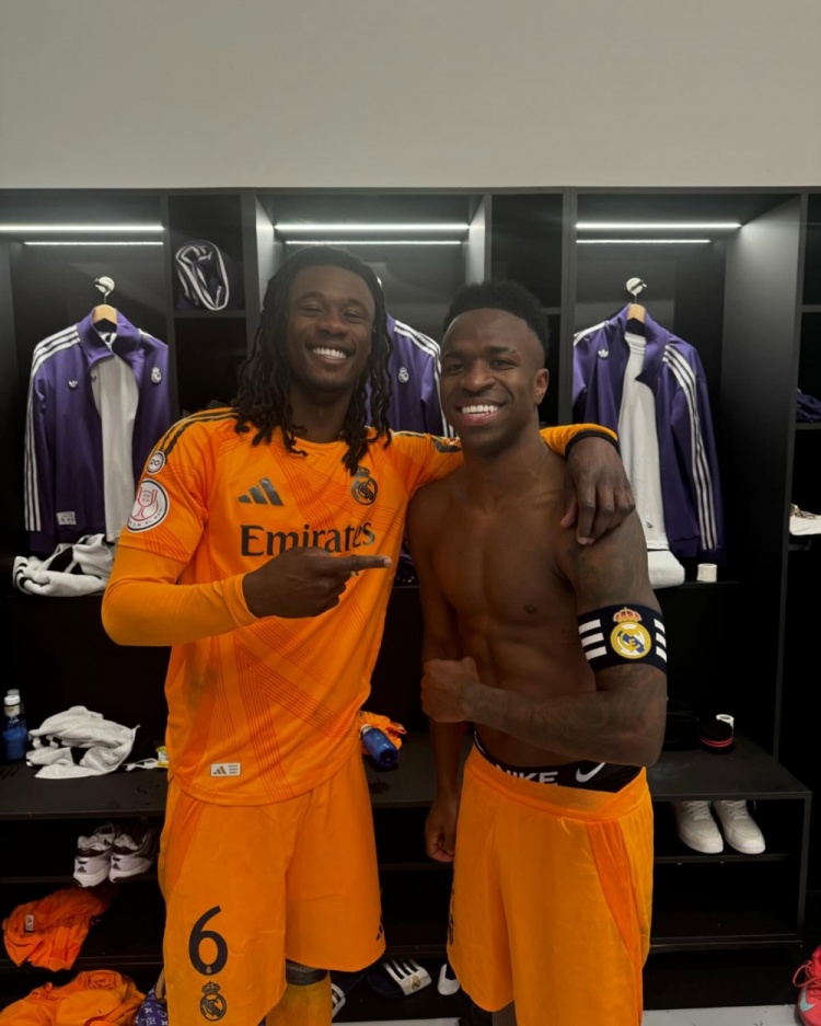 卡馬文加曬出自己與維尼修斯的合照并寫道:“和隊長維尼修斯(后面還有莫德里奇、巴斯克斯、塞巴略斯和巴爾韋德)以及攝影師的照片????”