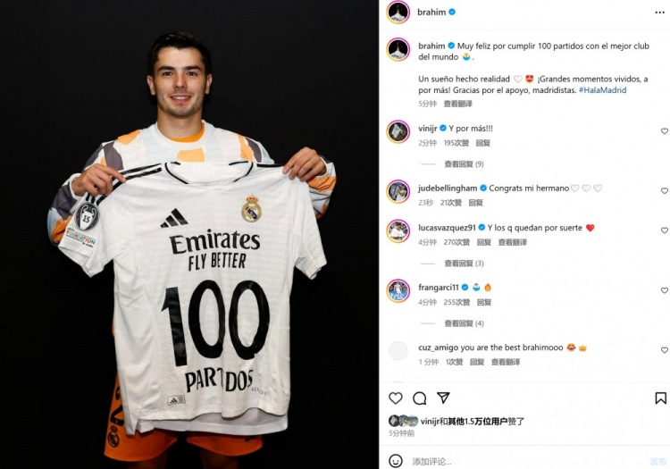 這也是迪亞斯為皇馬各項賽事出戰(zhàn)的第100場比賽,賽后他也在個人社媒曬出與100場紀念球衣的合影,配文寫道:“很高興能為世界最佳俱樂部完成100次出場,一個夢想實現(xiàn)了。美好的瞬間永存,讓我們?nèi)幦「?!感謝皇馬球迷的支持!”