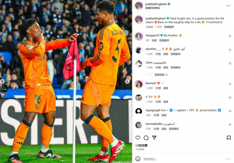 本場比賽貝林厄姆助攻恩德里克破門,賽后貝林厄姆在個人社媒曬出與恩德里克互動慶祝合照,配文寫道:“一場艱難的勝利,為下回合創(chuàng)造了不錯的局面。淘氣的舞步回歸。”