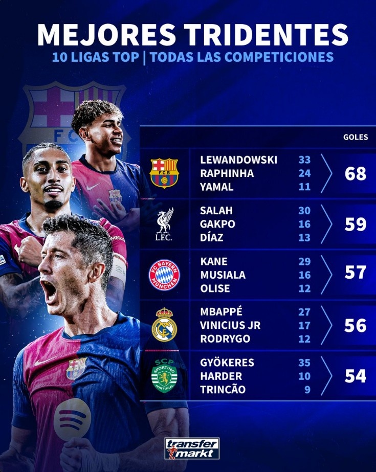 2月27日訊 德轉盤點了本賽季歐洲前十聯賽各項賽事進球最多鋒線三叉戟,其中巴薩三將以68球領跑,具體如下: