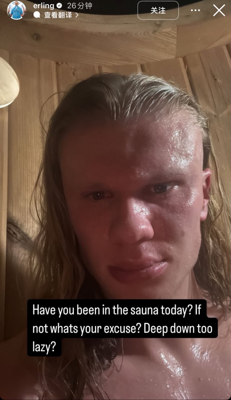 哈蘭德配文寫道:“今天你蒸桑拿了嗎?如果沒有,那你的理由是什么?是因為內(nèi)心深處的懶惰嗎?”