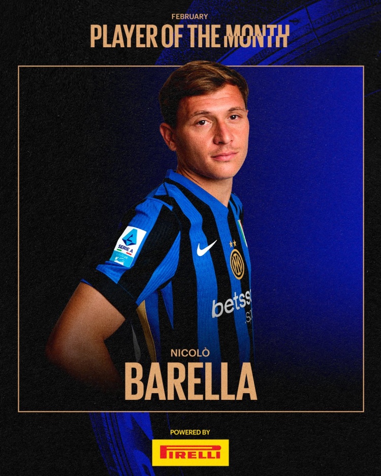 在2月,巴雷拉代表國米在各項賽事中出戰(zhàn)了6場比賽。最終,他擊敗了勞塔羅等人,當(dāng)選隊內(nèi)最佳球員。
