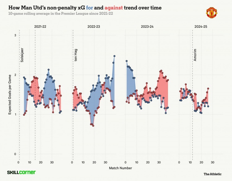不過(guò),對(duì)比兩位主帥治下曼聯(lián)的進(jìn)攻基礎(chǔ)數(shù)據(jù),又會(huì)發(fā)現(xiàn),曼聯(lián)的進(jìn)攻實(shí)際上是有所倒退的。較低的預(yù)期進(jìn)球和較少的射門(mén)數(shù)表明,阿莫林仍有很多工作要做,只有曼聯(lián)真正貫徹了阿莫林的進(jìn)攻思想,才有可能形成“肌肉記憶”。