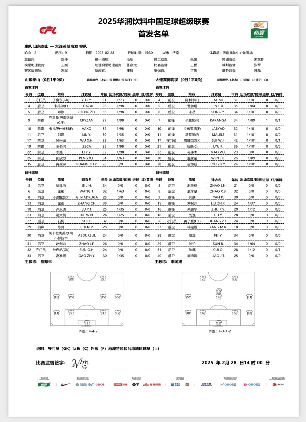 泰山聯(lián)賽第二輪首發(fā)出爐,謝文能替補(bǔ)。