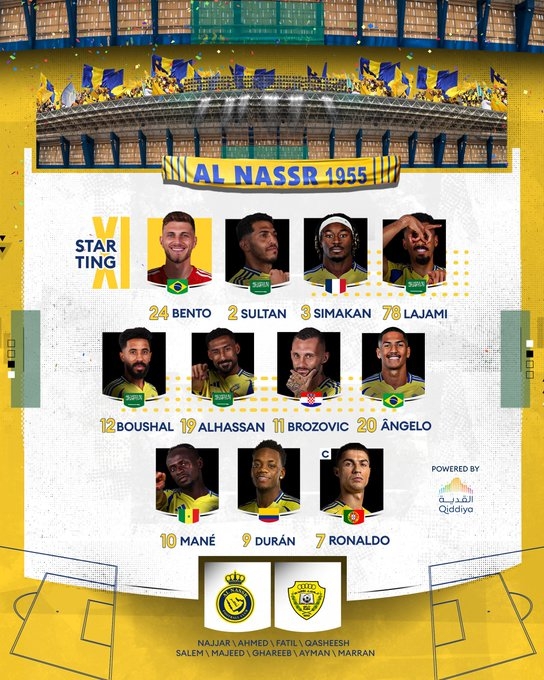 利雅得勝利替補:36-納賈爾、22-阿馬德、4-法蒂爾、50-卡謝什、83-納吉迪、8-蘇萊西姆、29-加里卜、23-葉海亞、16-馬蘭