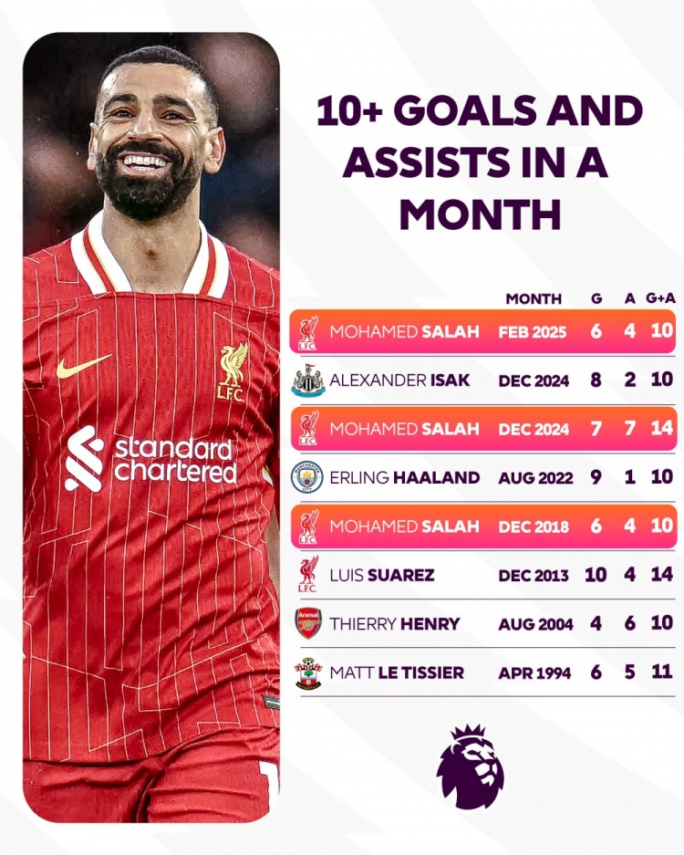 2月28日訊 英超官方盤點(diǎn),薩拉赫是英超歷史上僅有的多次單月聯(lián)賽制造10+球的球員,而薩拉赫至今已經(jīng)有3次。