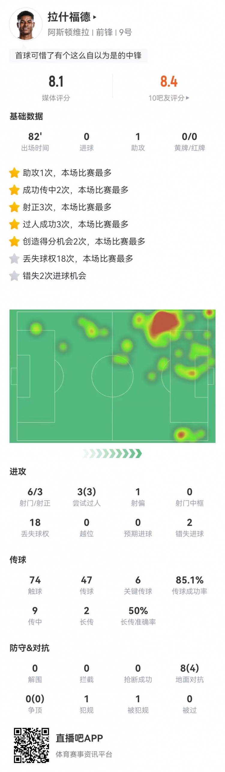 3月1日訊 維拉在本輪足總杯2-0擊敗卡迪夫城,拉什福德本場數(shù)據(jù)如下: