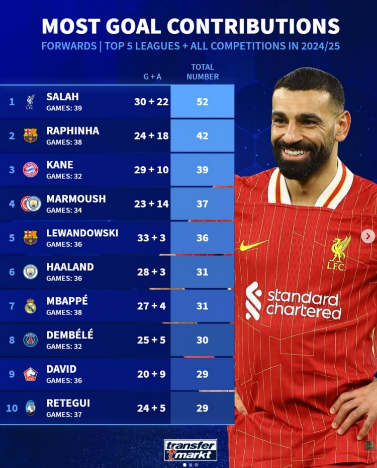 3月1日訊 德轉盤點了本賽季目前五大聯賽前鋒在各項賽事中參與進球榜,其中薩拉赫以52球遙遙領先,拉菲尼亞、凱恩列二、三位。以下為具體榜單(進球+助攻):