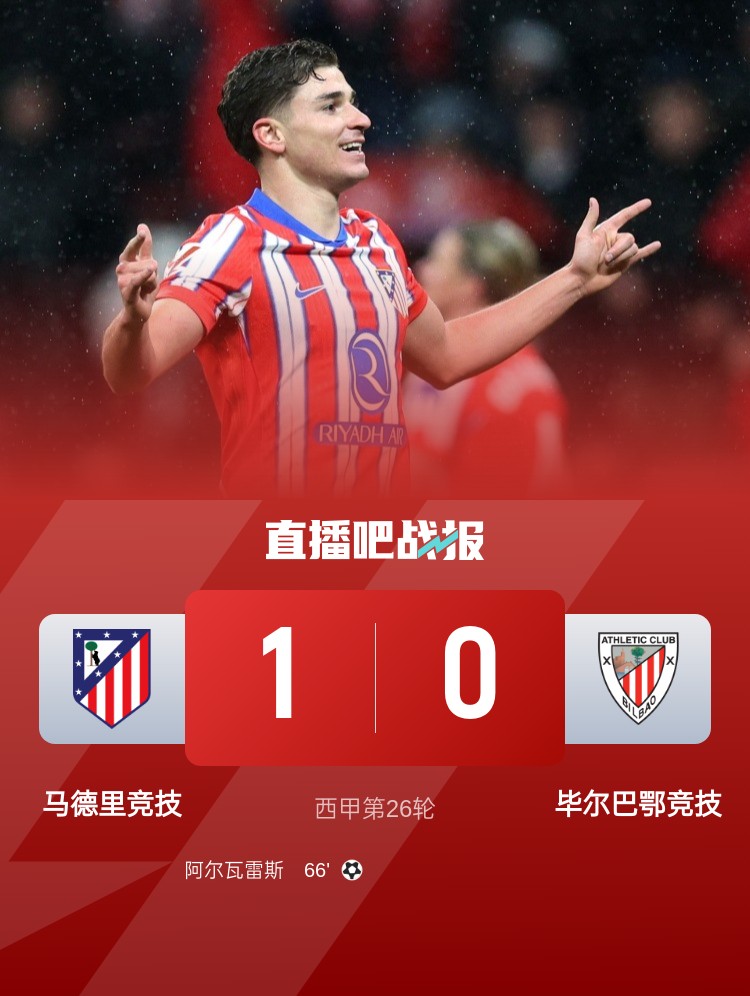 本輪西甲,馬競1-0擊敗畢巴,阿爾瓦雷斯攻入全場唯一進(jìn)球。此役后,馬競先賽登頂。