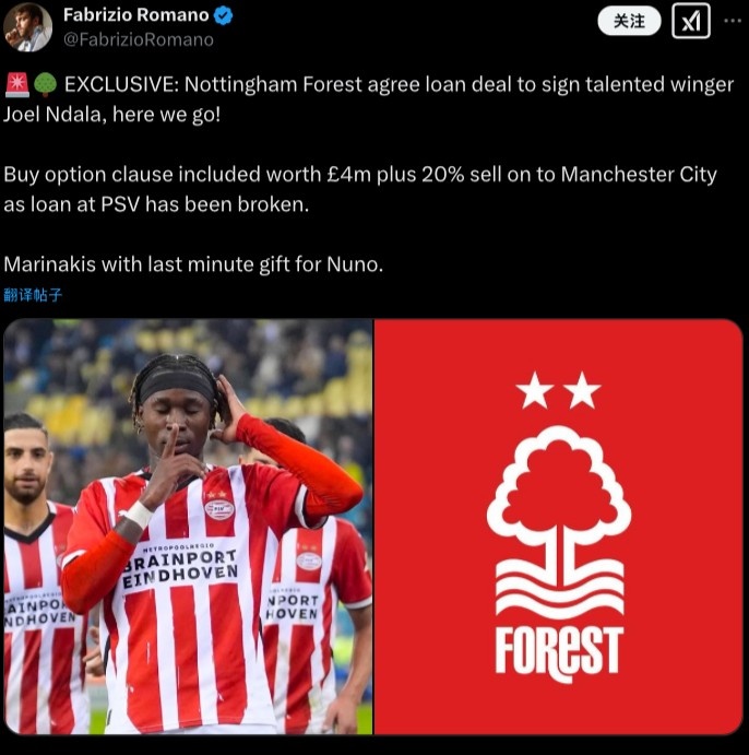 羅馬諾在社媒寫道:“獨家消息:諾丁漢森林同意以租借方式簽下天才邊路球員喬爾-恩達拉,HWG!由于曼城和埃因霍溫就球員租借的相關事項已經(jīng)破裂,諾丁漢森林從中介入,據(jù)悉租借合同中將附帶400萬鎊+20%未來轉(zhuǎn)會分成的買斷條款。”