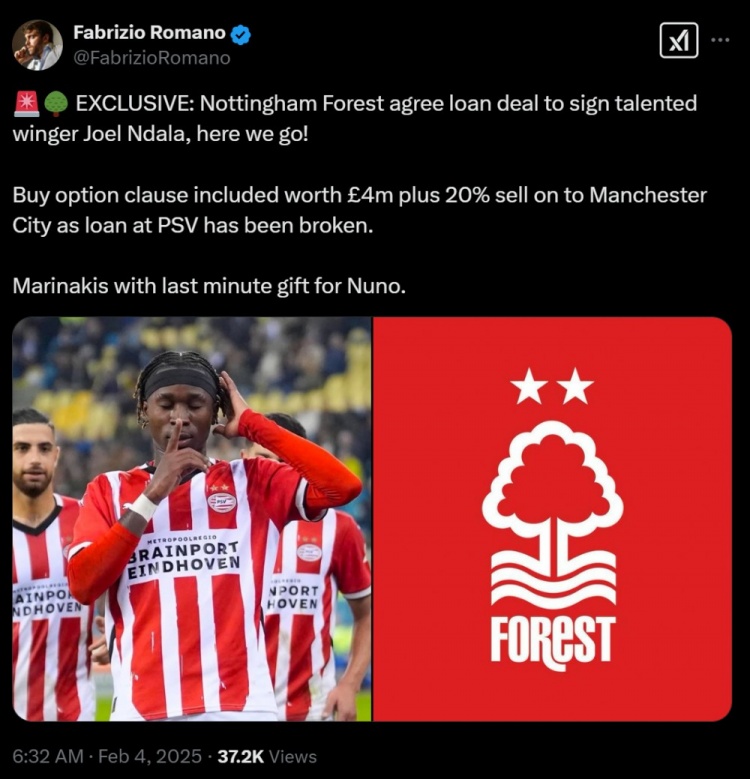 2月4日訊 羅馬諾用標志性的here we go 確認,森林將租借18歲曼城邊鋒恩達拉,球員在埃因霍溫的租期提前結(jié)束。