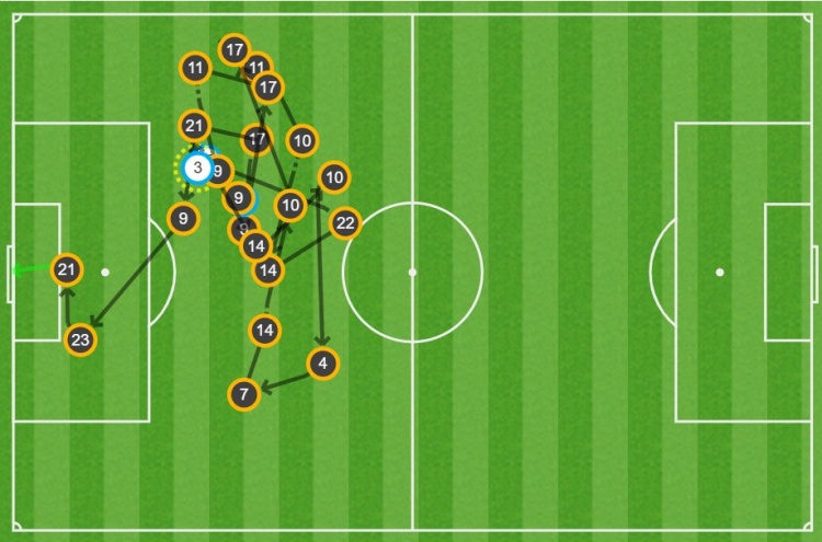 據(jù)統(tǒng)計(jì),這粒進(jìn)球經(jīng)過了皇馬球員19次連續(xù)傳球后打進(jìn)。在皇馬本賽季西甲所有客場(chǎng)進(jìn)球中,這是皇馬進(jìn)球前傳遞次數(shù)最多的一粒進(jìn)球。