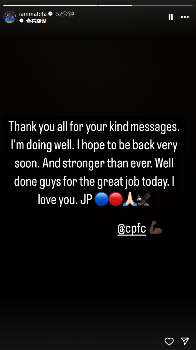 賽后馬特塔在社媒發(fā)文報(bào)平安:“感謝大家充滿溫暖的消息,我現(xiàn)在感覺很好,希望很快就能回歸,而且會(huì)是比以往任何時(shí)候都更強(qiáng)大的姿態(tài),大家今天踢得很棒,我愛你們。”