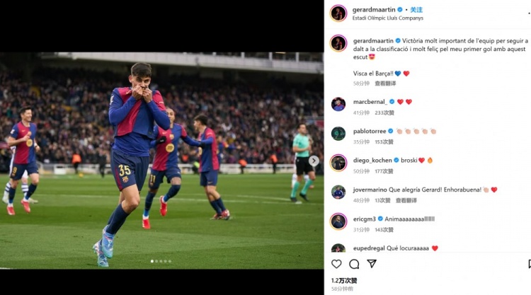 馬丁也在賽后通過社媒曬出自己親吻隊徽的照片,并配文:“這場勝利對球隊保住榜首位置至關(guān)重要,非常高興能夠為巴薩打進我的處子球?!?/p>