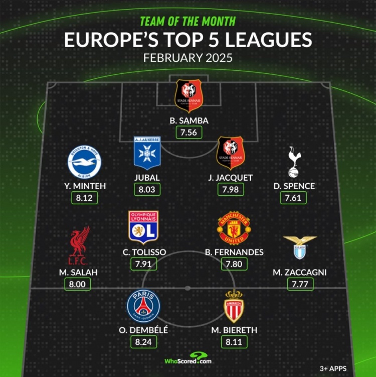 whoscored五大聯(lián)賽2月最佳陣容:至少出場3次