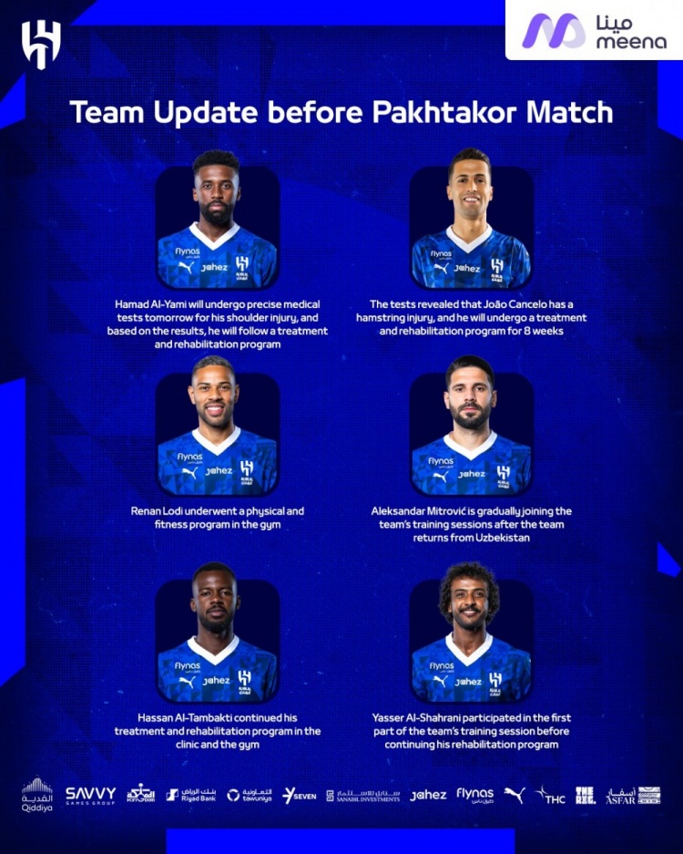 3月3日訊 利雅得新月官方更新了隊(duì)內(nèi)6位球員的最新傷病情況,其中坎塞洛腿筋受傷,預(yù)計(jì)傷停8周。