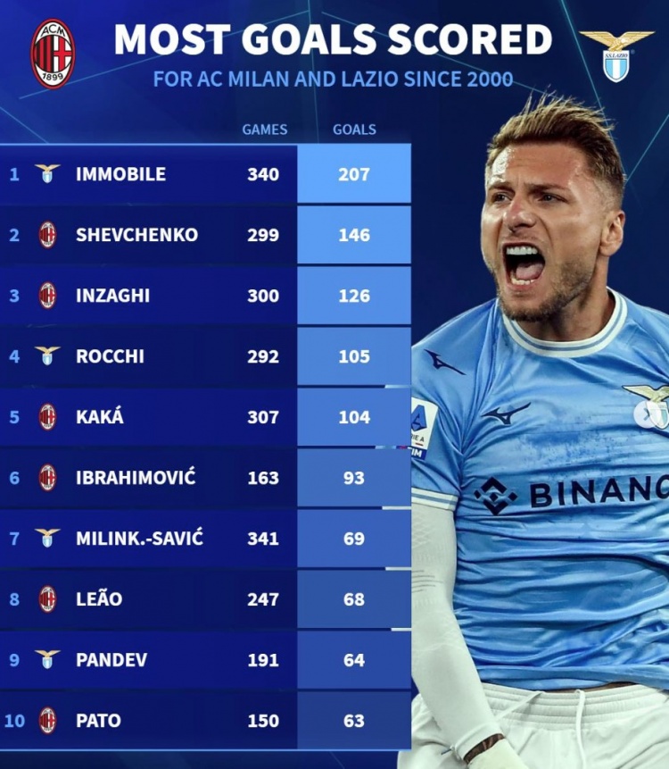 3月3日訊 米蘭將在本輪意甲焦點戰(zhàn)主場迎戰(zhàn)拉齊奧,《轉會市場》也列出了兩隊新世紀射手榜。