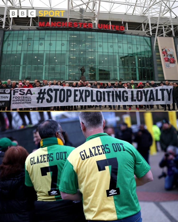 比賽開始前,兩隊(duì)球迷在老特拉福德球場前進(jìn)行了聯(lián)合抗議活動,拉出了寫有“停止剝削忠誠”的橫幅。此外,也有部分曼聯(lián)球迷仍在堅(jiān)持表達(dá)對格雷澤家族的不滿,他們穿上了印有“格雷澤滾蛋”的球衣。