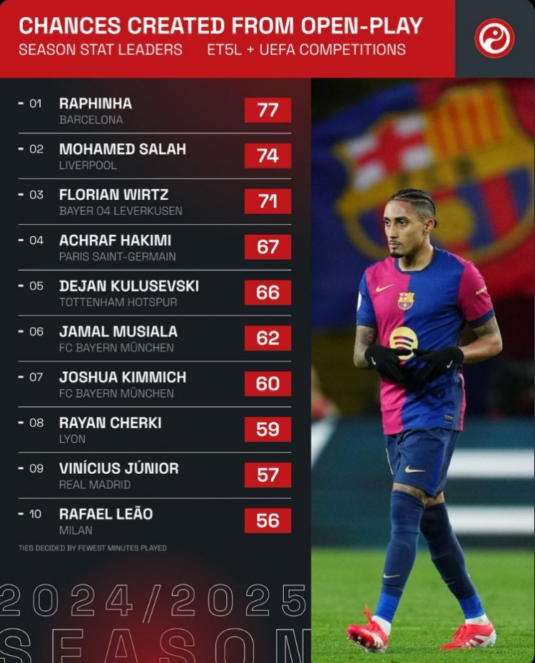 3月3日訊數(shù)據(jù)網(wǎng)站Squawka盤點(diǎn)了本賽季五大聯(lián)賽球員在聯(lián)賽以及歐戰(zhàn)比賽中,運(yùn)動(dòng)戰(zhàn)創(chuàng)造機(jī)會(huì)榜,其中拉菲尼亞居首,薩拉赫次席,具體如下: