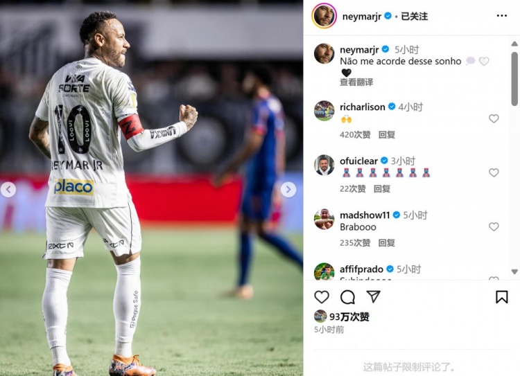 本場(chǎng)比賽內(nèi)馬爾任意球破門(mén),在加盟桑托斯以來(lái)7場(chǎng)比賽3球3助攻。賽后內(nèi)馬爾也在個(gè)人社媒曬出本場(chǎng)慶祝照片,配文寫(xiě)道:“不要把我從夢(mèng)中叫醒?!?/span>