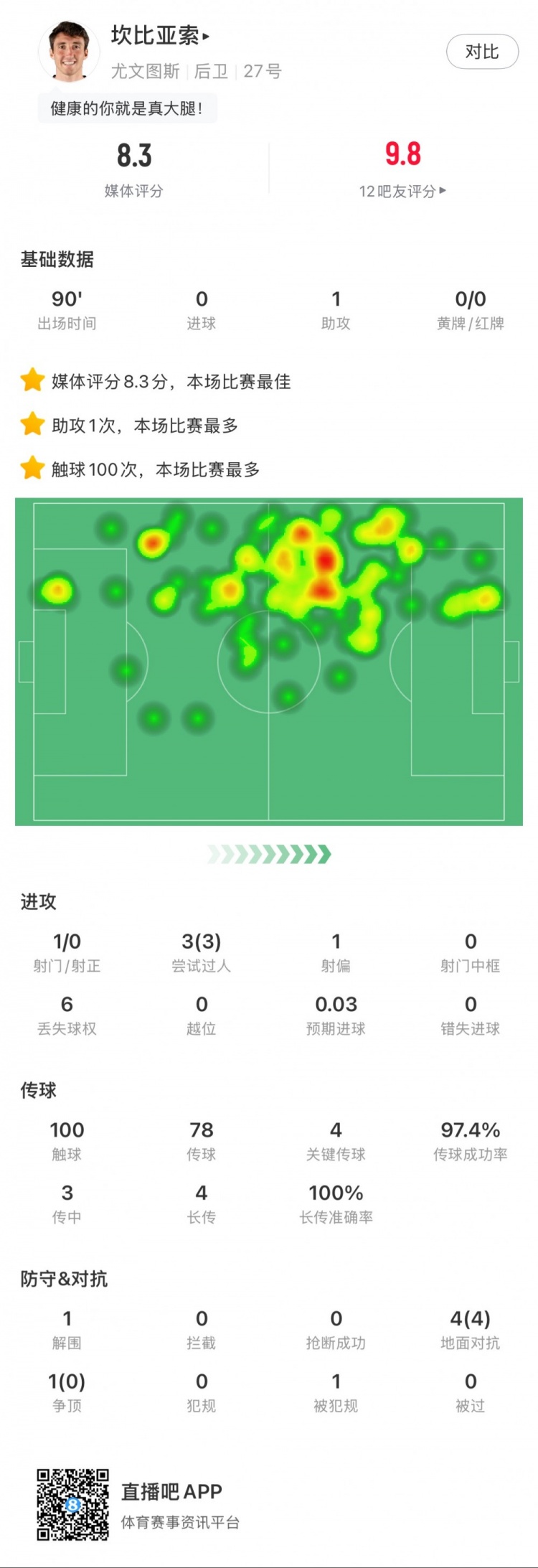 3月4日訊 意甲第27輪,尤文2-0維羅納。坎比亞索本場數(shù)據(jù):