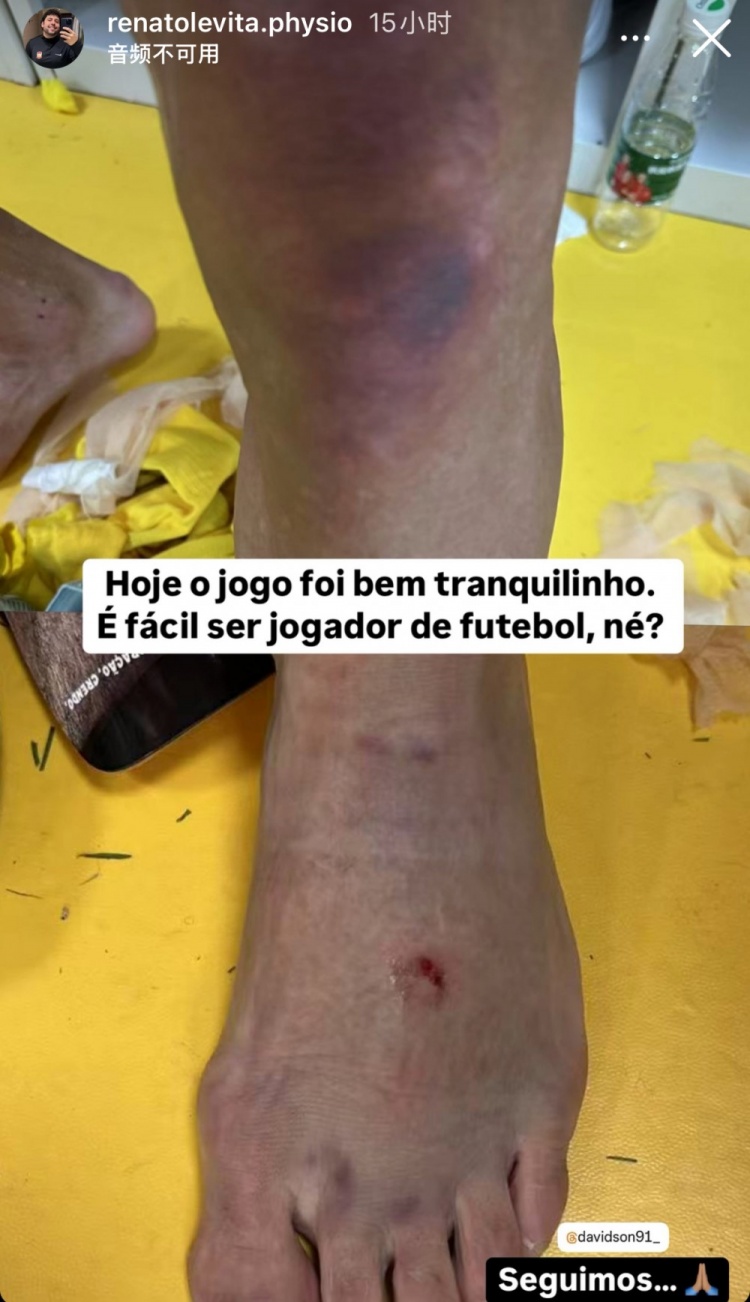 本場比賽戴維森打滿全場,作為西海岸核心球員的他,自然也得到了三鎮(zhèn)隊(duì)的重點(diǎn)“關(guān)照”。從西海岸理療師社媒曬出的照片可以看到,一場比賽下來,戴維森的腿部已是傷痕累累,西海岸理療師為此配文寫道:“一場平靜的比賽。當(dāng)足球運(yùn)動員很容易,對吧?”