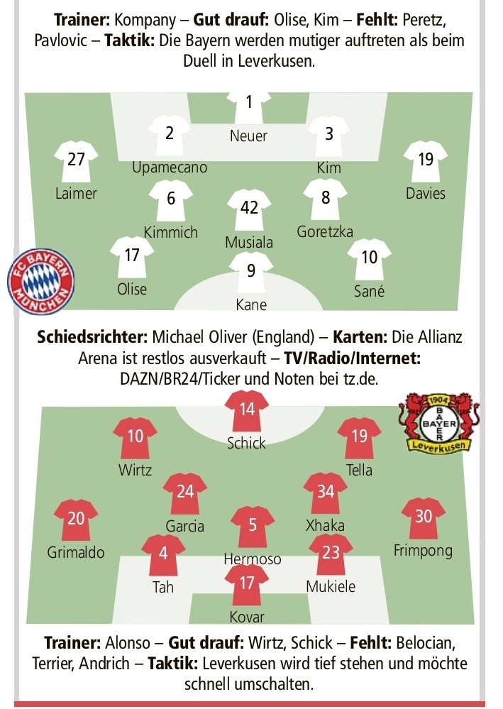 諾伊爾/萊默爾、于帕梅卡諾、金玟哉、戴維斯/基米希、格雷茨卡/奧利塞、穆西亞拉、薩內(nèi)/凱恩