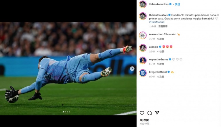 庫(kù)爾圖瓦曬出自己的撲救照,并配文:“還剩90分鐘,但我們已經(jīng)邁出了第一步。感謝球迷們?cè)诓{烏營(yíng)造的神奇氛圍!”