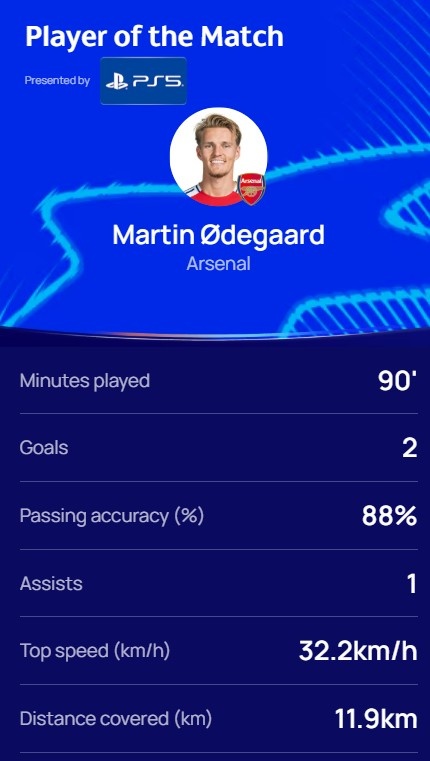 本場(chǎng)比賽厄德高發(fā)揮出色,打進(jìn)2球并有1次助攻,傳球成功率88%,跑動(dòng)距離達(dá)到11.9km,賽后他也當(dāng)選歐冠官方本場(chǎng)最佳球員。