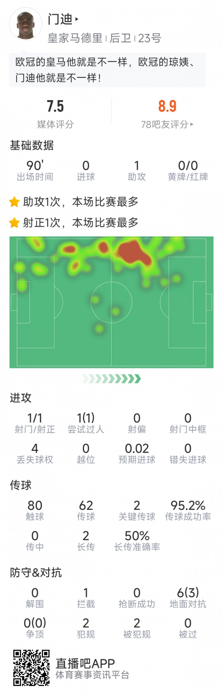 3月5日訊 在本輪歐冠皇馬2-1擊敗馬競的比賽中,門迪送出一次助攻,以下為他在本場數(shù)據(jù):