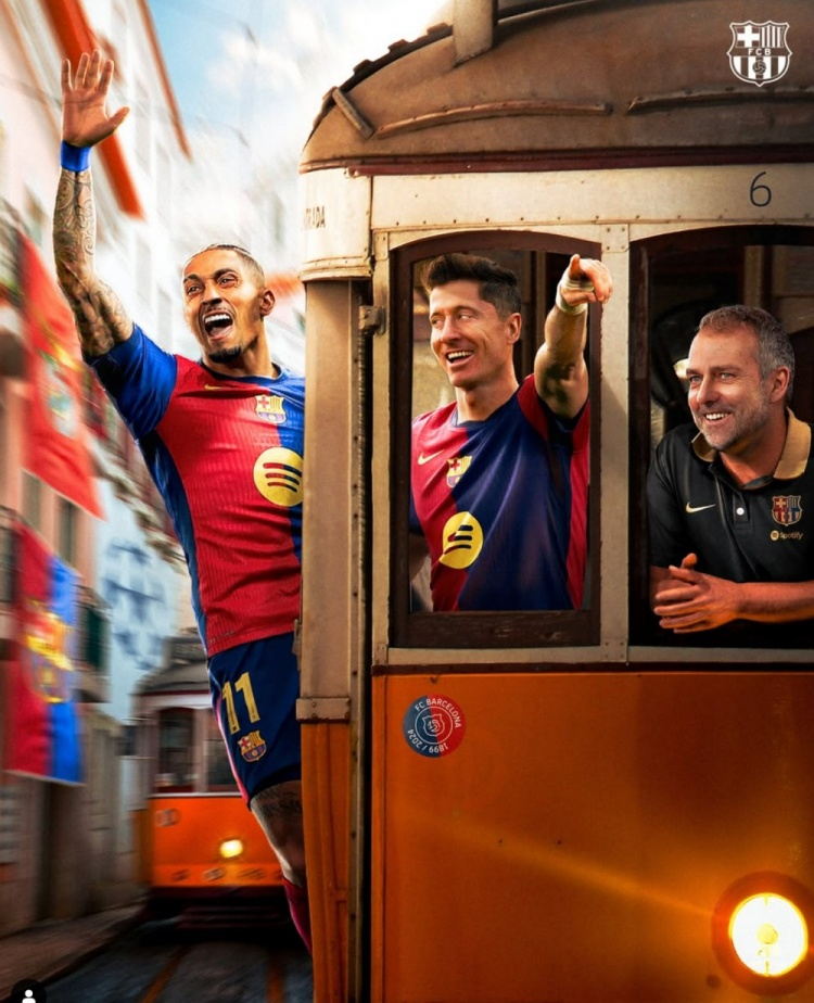 海報(bào)中弗里克、萊萬以及拉菲尼亞坐在前往里斯本的列車上,球隊(duì)官方社媒也配文寫道:“我們重回里斯本!”