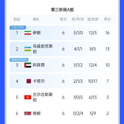 目前在世預(yù)賽亞洲區(qū)A組積分榜上,阿聯(lián)酋6輪3勝1平2負(fù)排在第三,距離第二的烏茲別克斯坦差3分。