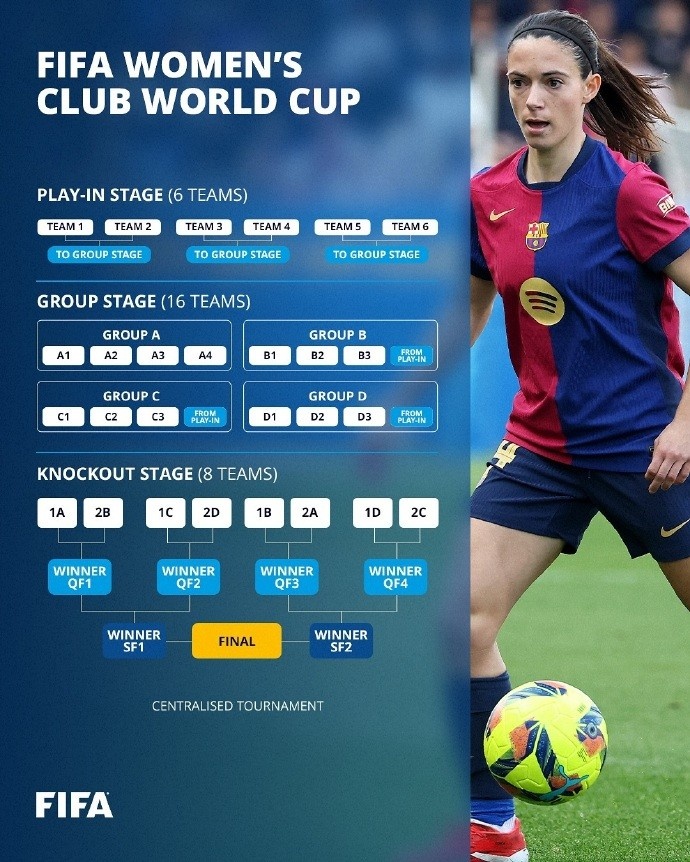 女足世俱杯具體的賽制方面,19個(gè)參賽名額分為13個(gè)小組賽名額以及6個(gè)分組資格賽名額,亞足聯(lián)、非洲足聯(lián)、中北美及加勒比海足聯(lián)和南美足聯(lián)各有兩個(gè)小組賽名額,歐足聯(lián)則有五個(gè)小組賽名額,分組資格賽名額則六大足聯(lián)各有1個(gè)。女足世俱杯分為三個(gè)階段,首先是分組資格賽階段(play-in),6支球隊(duì)分三組進(jìn)行單回合淘汰賽,決出3個(gè)晉級小組賽的名額。隨后是16支球隊(duì)(13支小組賽球隊(duì)+3支分組資格賽勝者)組成的小組賽階段,16隊(duì)分為四組,每組前兩名球隊(duì)晉級淘汰賽。淘汰賽階段有8支球隊(duì)參加,采取單回合淘汰賽賽制。