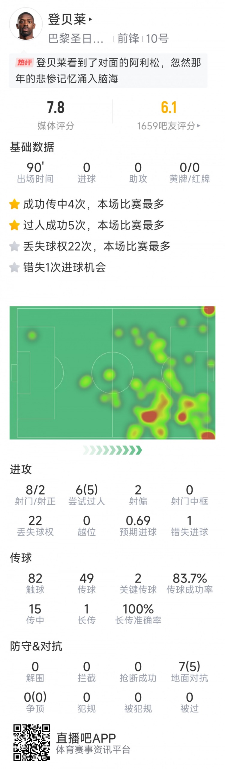 3月6日訊 在本輪歐冠,巴黎0-1不敵利物浦。本場(chǎng)比賽登貝萊首發(fā)登場(chǎng),以下為他在本場(chǎng)數(shù)據(jù):