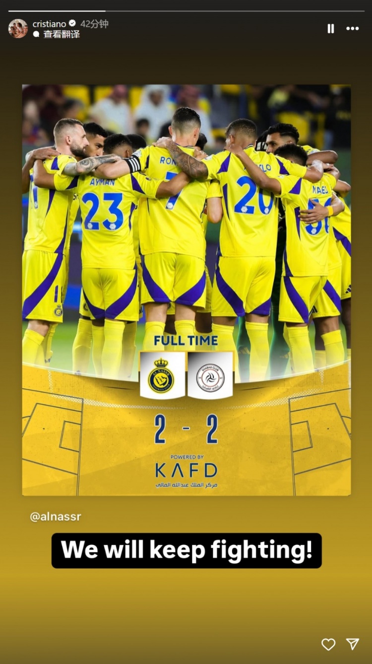 沙特聯(lián)第24輪利雅得勝利主場2-2戰(zhàn)平利雅得青年人,本場比賽C羅破門攻入生涯第926球。賽后,C羅在個人社交媒體少出全隊擁抱的照片,寫道:我們會繼續(xù)戰(zhàn)斗! 標(biāo)簽: 足球 利雅得勝利 C羅