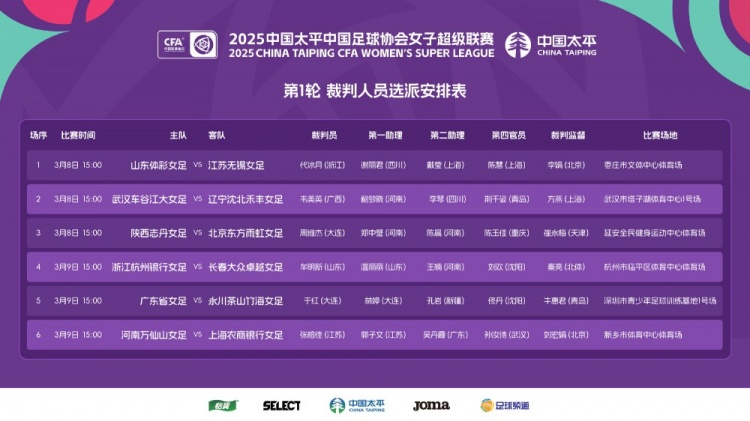 2025中國太平女超聯(lián)賽第1輪 裁判人員選派名單 ???