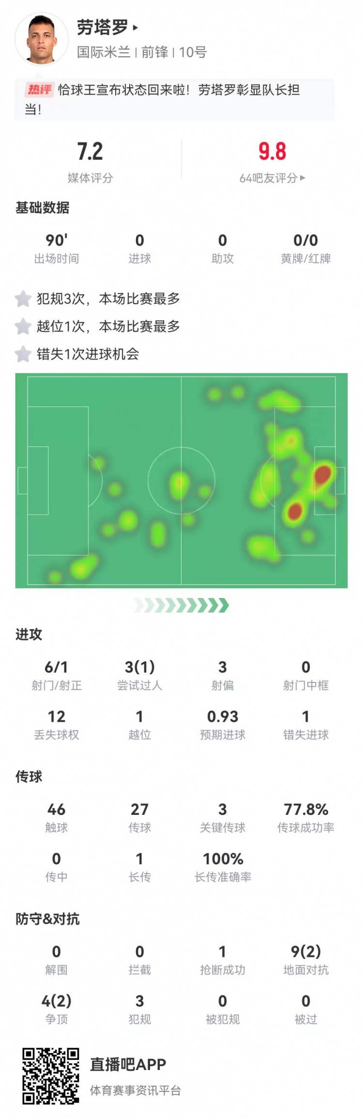 3月9日訊 國(guó)米在本輪意甲3-2逆轉(zhuǎn)蒙扎,勞塔羅本場(chǎng)數(shù)據(jù)如下: