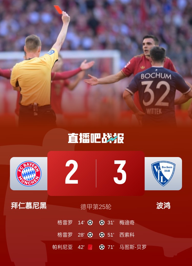 3月9日訊 北京時間8日晚,德甲第25輪,拜仁主場2-3不敵波鴻。