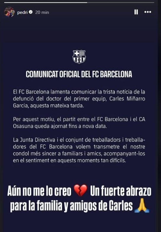 3月9日訊 今天凌晨,巴塞羅那俱樂部宣布一線隊隊醫(yī)卡萊斯-米尼亞羅-加西亞不幸離世,而球隊原定于北京時間凌晨4:00對陣奧薩蘇納的比賽也被推遲。