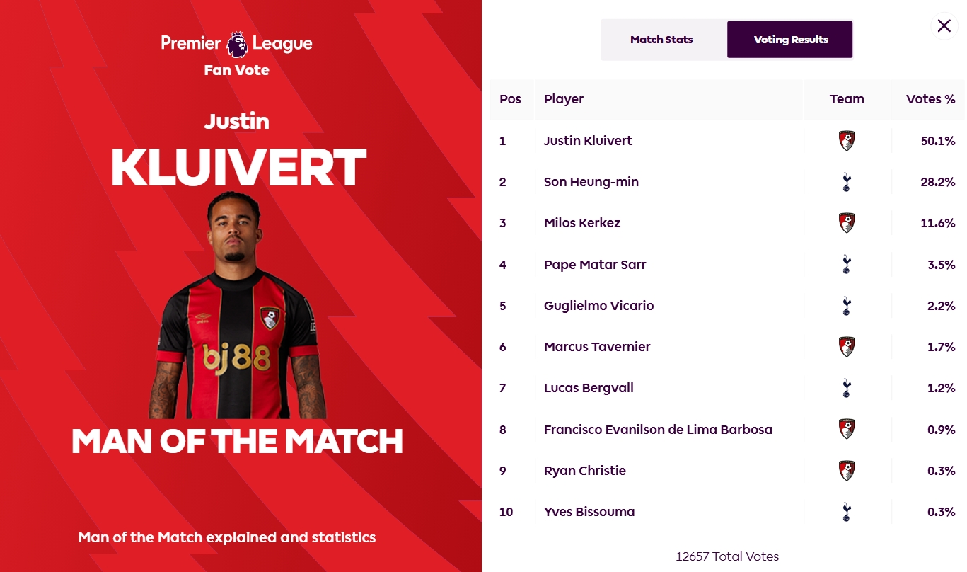 3月10日訊 在本輪英超,伯恩茅斯2-2戰(zhàn)平熱刺。本場比賽伯恩茅斯前鋒小克魯伊維特發(fā)揮出色,送出一次助攻,賽后他也以超過50%的得票率當(dāng)選英超官方球迷票選全場最佳球員。 標(biāo)簽: 足球 英超 伯恩茅斯