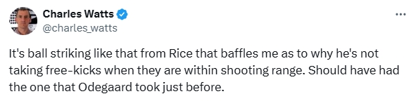 在賴斯進球后,阿森納系的記者Charles Watts在社媒表示:“賴斯這樣的射門讓我困惑了,為什么獲得射程范圍以內的任意球時不讓他去主罰呢?之前厄德高主罰的那個任意球應該讓他去踢?!?/p>