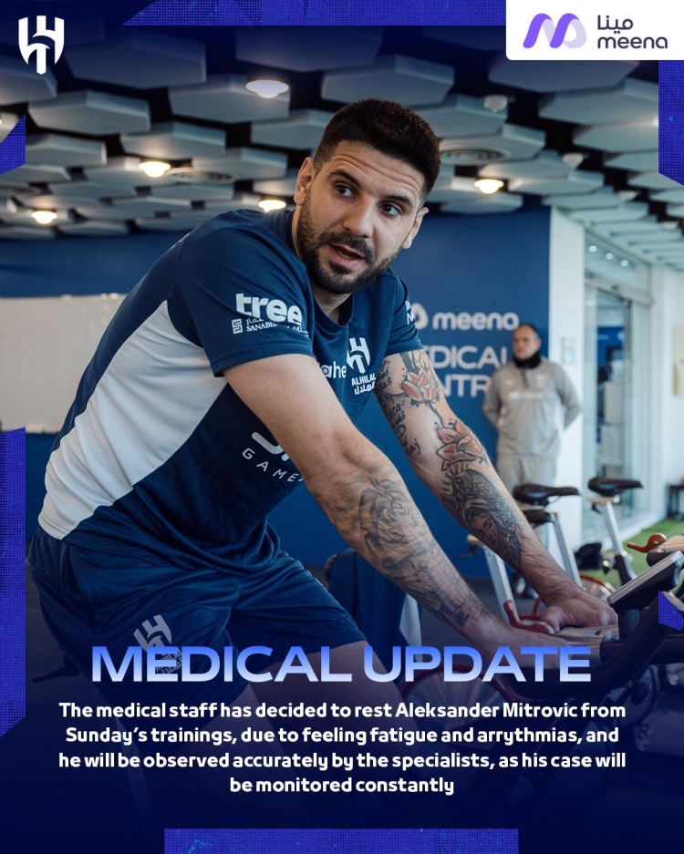 利雅得新月官方寫道:“由于感到疲勞和心律不齊,醫(yī)務(wù)人員決定讓米特洛維奇在周日的訓(xùn)練中休息,專家將對他進(jìn)行精確觀察,他的情況會(huì)得到持續(xù)檢測。”