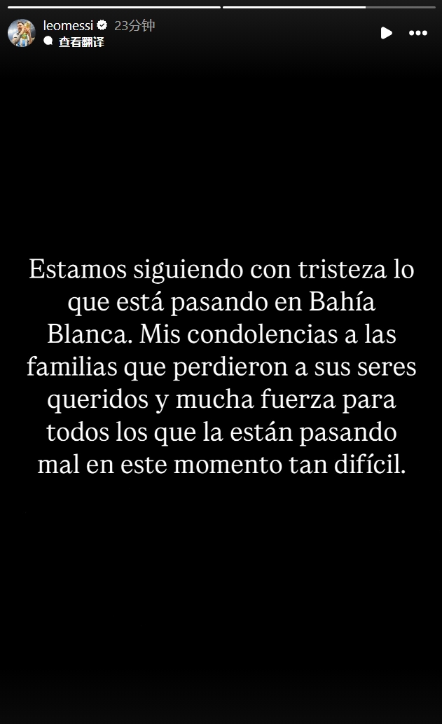 梅西寫道:“我們懷著悲痛的心情關(guān)注著bahía blanca正在發(fā)生的事情,我向那些失去親人的家庭致以哀悼,也希望所有在這個艱難時刻正經(jīng)歷困境的人能擁有力量。”